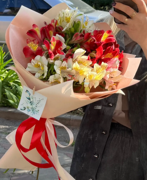 Изящный букет из альстромерий в красных, сливочных и белых оттенках покоряет своей лёгкостью и гармонией. Яркие акценты красного придают композиции выразительность, а мягкие сливочные и белые тона добавляют нежности и утончённости. Цветы выглядят воздушно и элегантно, создавая ощущение тепла и искренних эмоций.