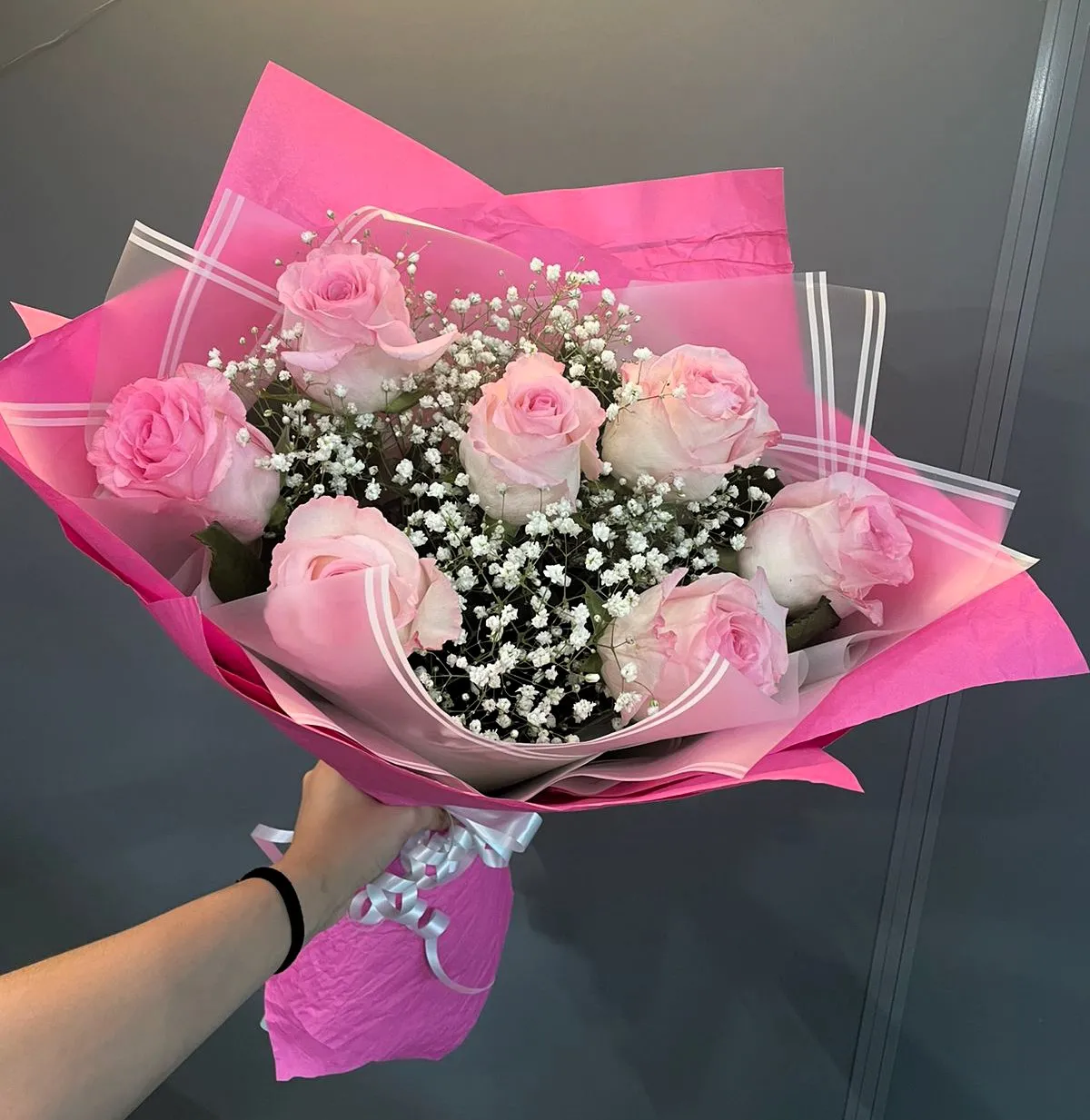 • Стандарт - роза - 7 шт., гипсофила, упаковка, лента