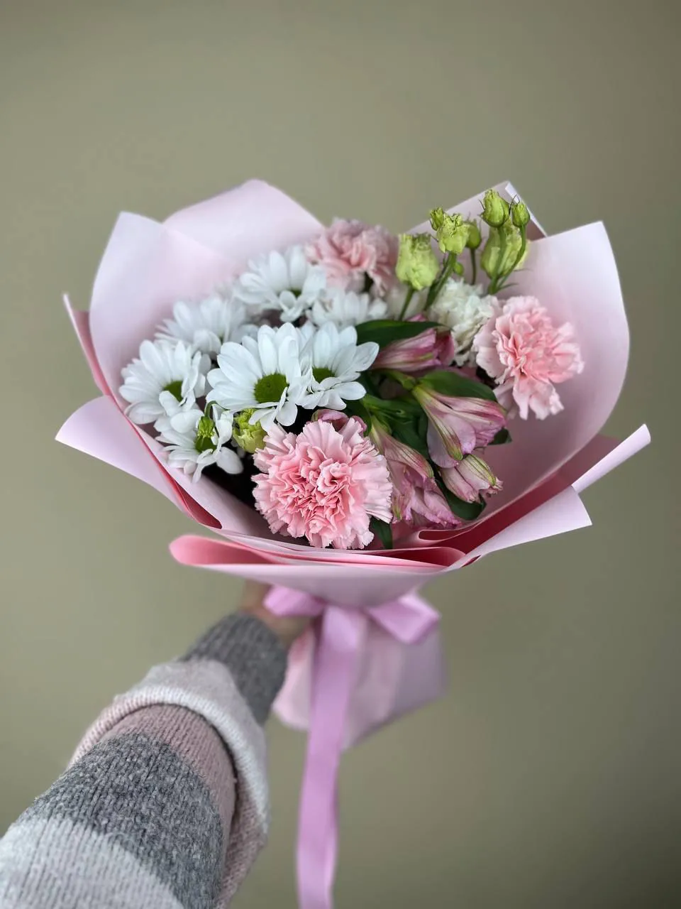 Представляем вашему вниманию восхитительный букет, который стал олицетворением нежности и утонченности. В его сердце расцветает ромашковая кустовая хризантема, придавая композиции яркие акценты и уютное очарование. Розовые альстромерии, словно облака веселья, эффектно обрамляют букет, даря ему легкость и трепет.