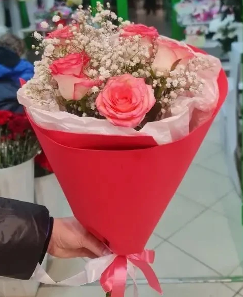 • Мини - роза - 5 шт., гипсофила, упаковка, лента