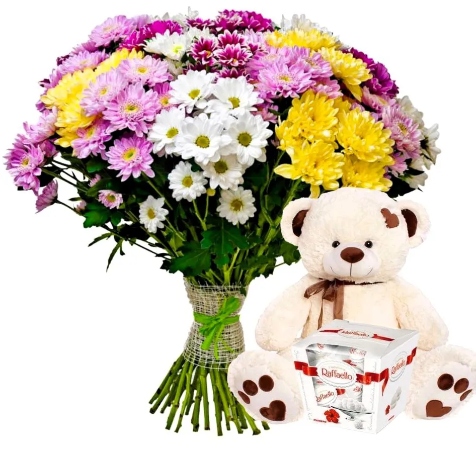 • Средний - кустовая хризантема - 15 шт., лента + Raffaello + игрушка 30 см
