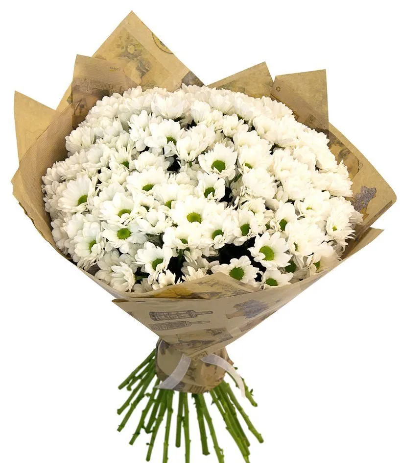 Белые ромашковые хризантемы подарят улыбку и весеннее настроение в любое время года.