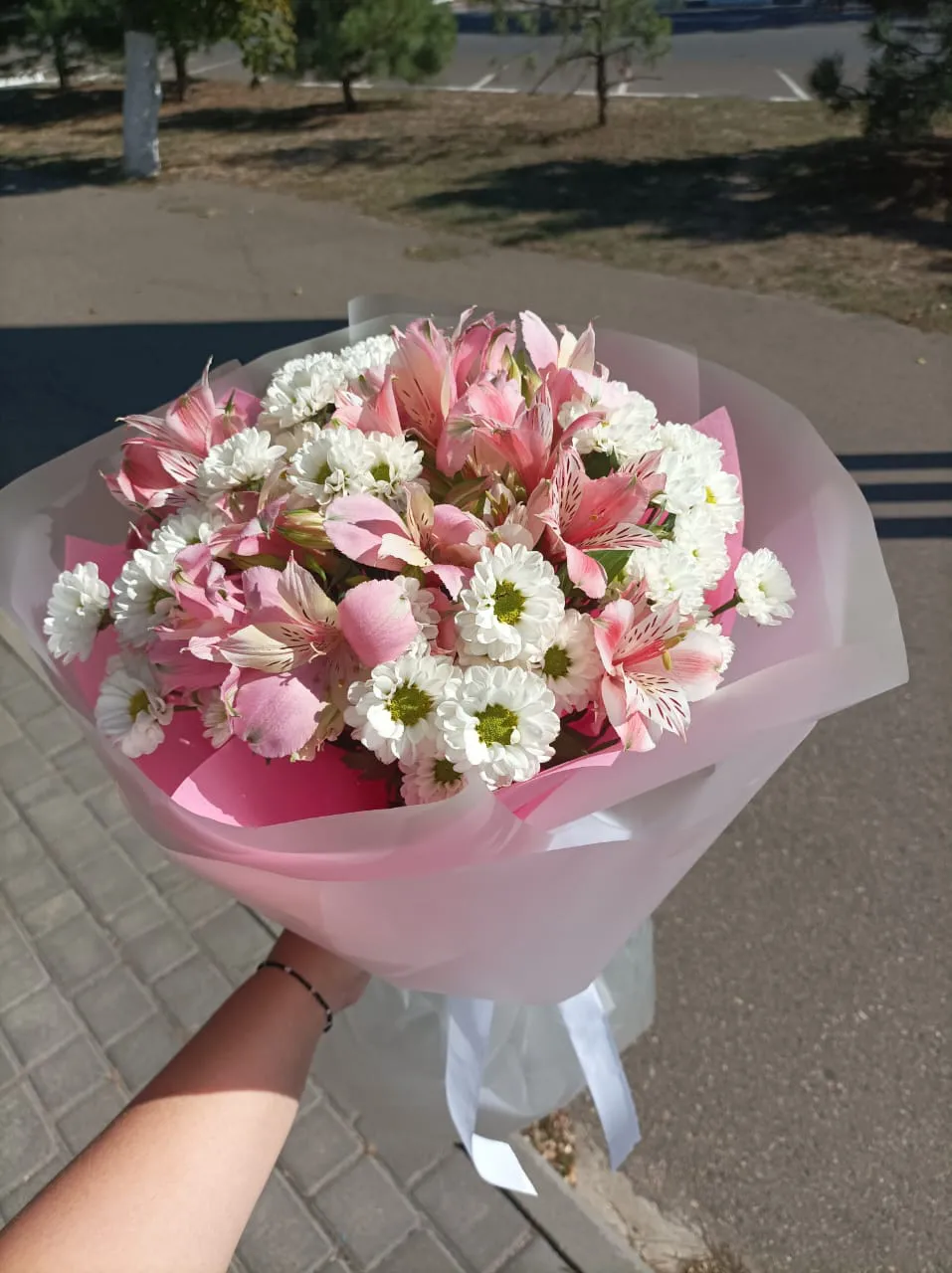 Этот изумительный букет, состоящий из нежных розовых альстромерий и ярких белых ромашковых хризантем, словно создан для того, чтобы дарить радость и свет. Альстромерии, с их тонкими лепестками и утонченным ароматом, добавляют в композицию легкость и романтическое настроение. Их нежный розовый оттенок символизирует теплоту и заботу.